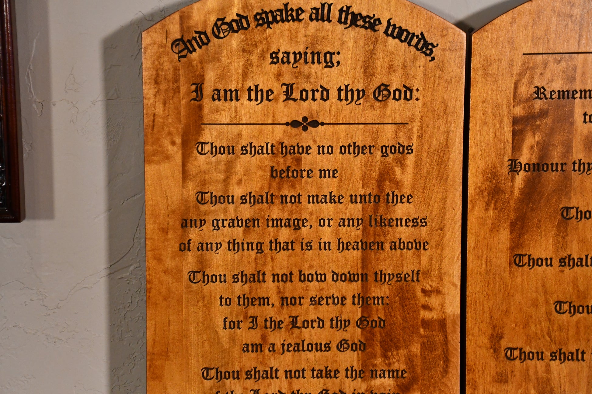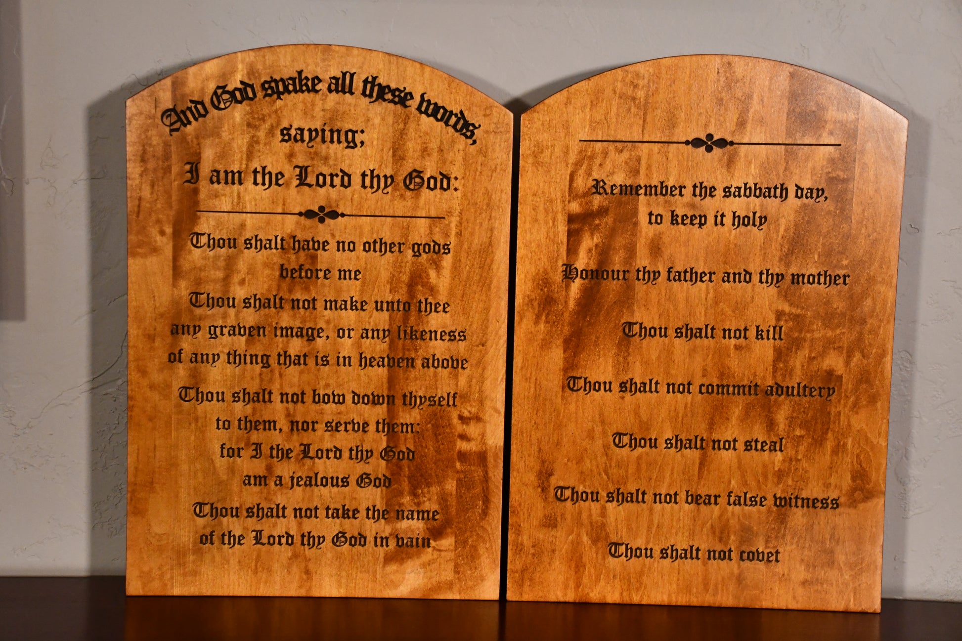 God's 10 commandments (The Law of Moses) commemorated in these beautiful solid wood tablets. Deeply engraved in Old King James version using old english script.