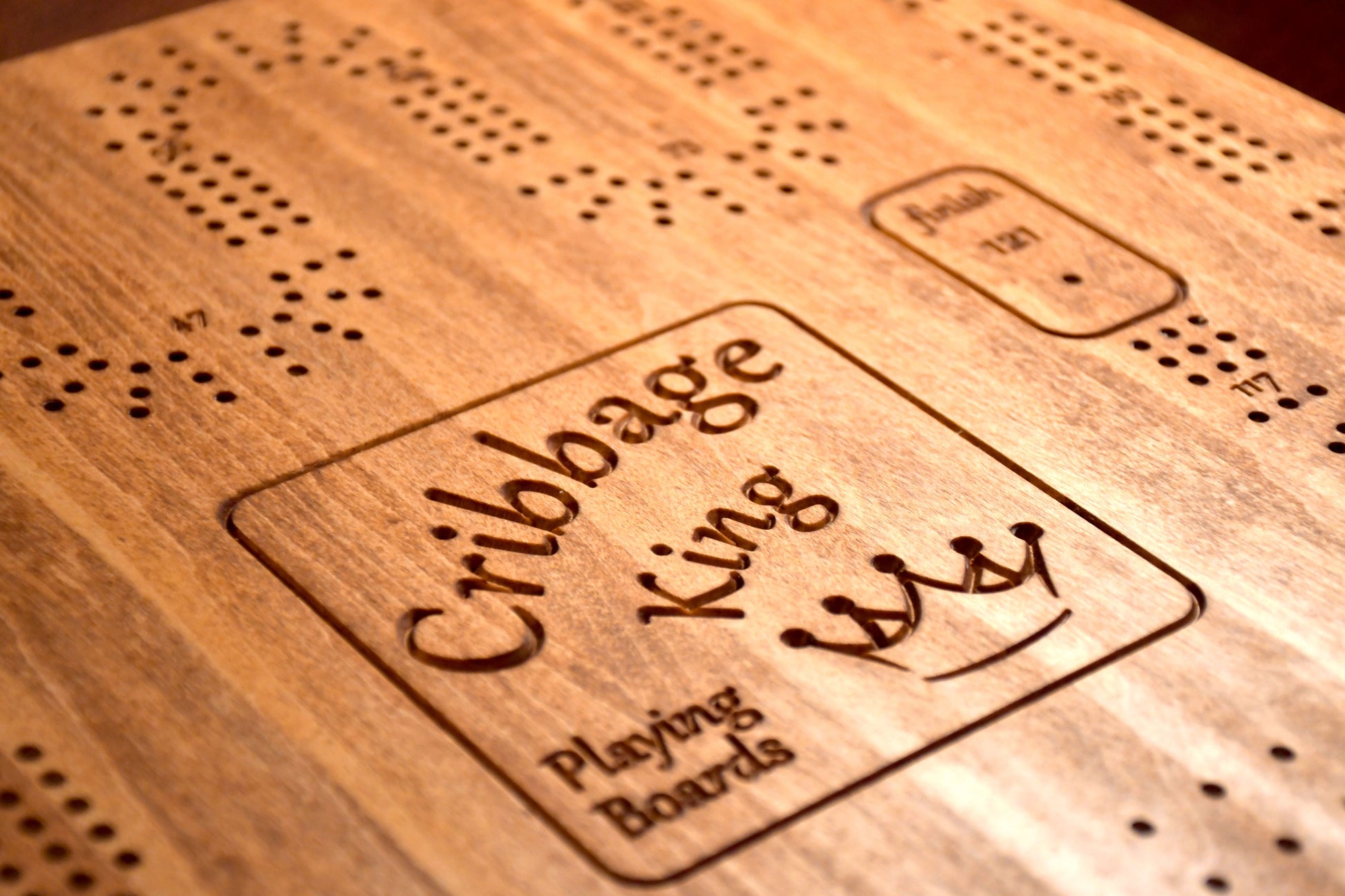 Solid hard maple stained and finished in either Walnut or Cherry color (Cherry color shown), super smooth to the touch and fun to play. The 3 row scoring holes are serpentine pattern with 121 holes to the finish. Numbers, letters and logo are deeply engraved (not laser) for a three-dimensional look. Your friends and family will have a lot of fun.