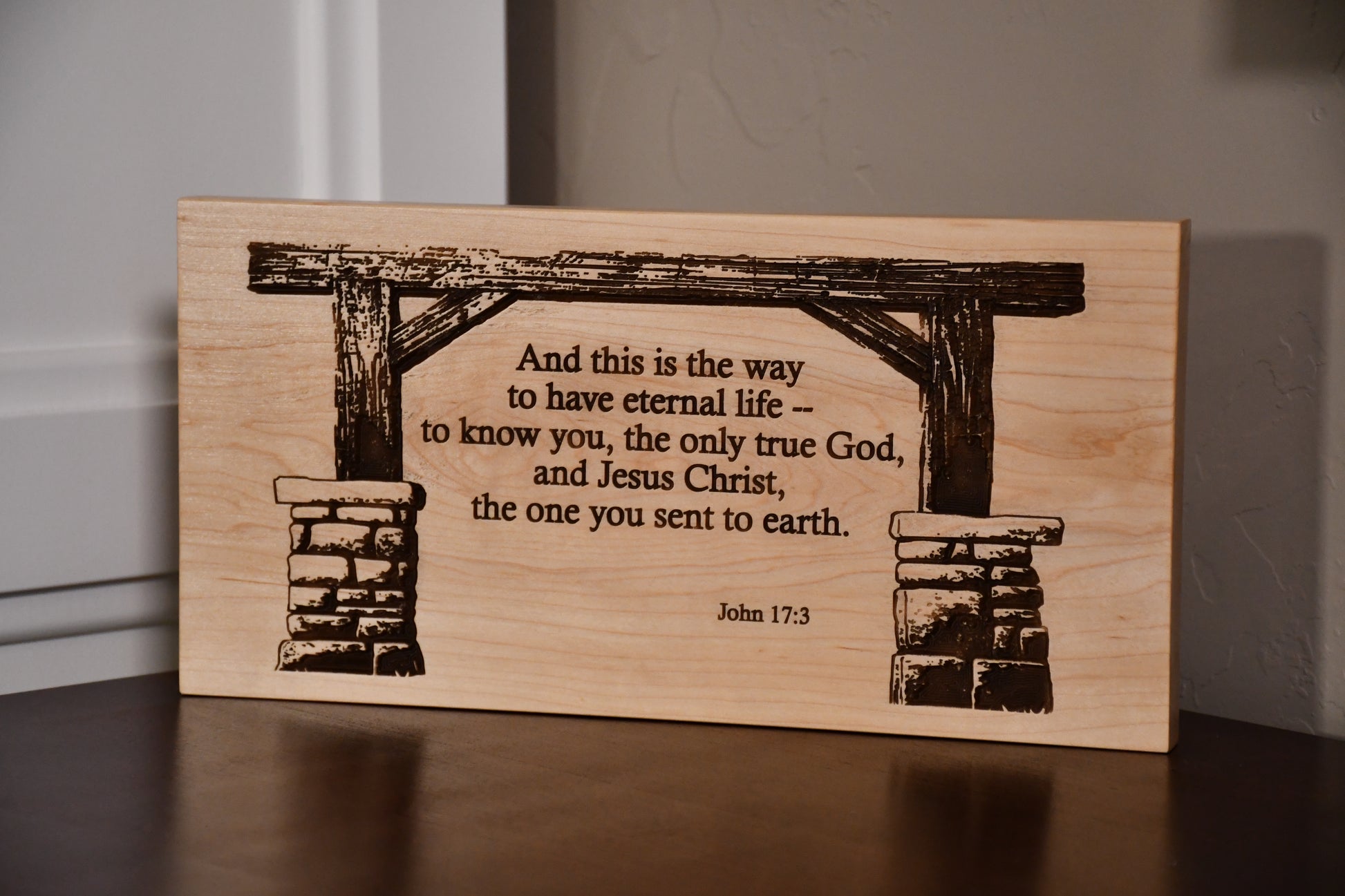 Beautiful engraved solid wood scripture plaque quoting the gospel of John 17:3